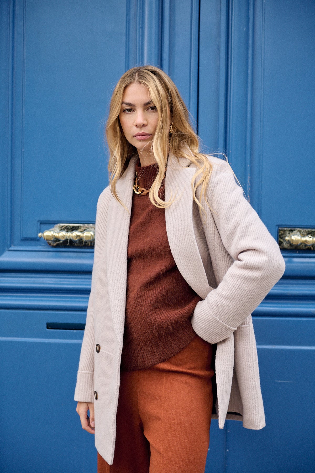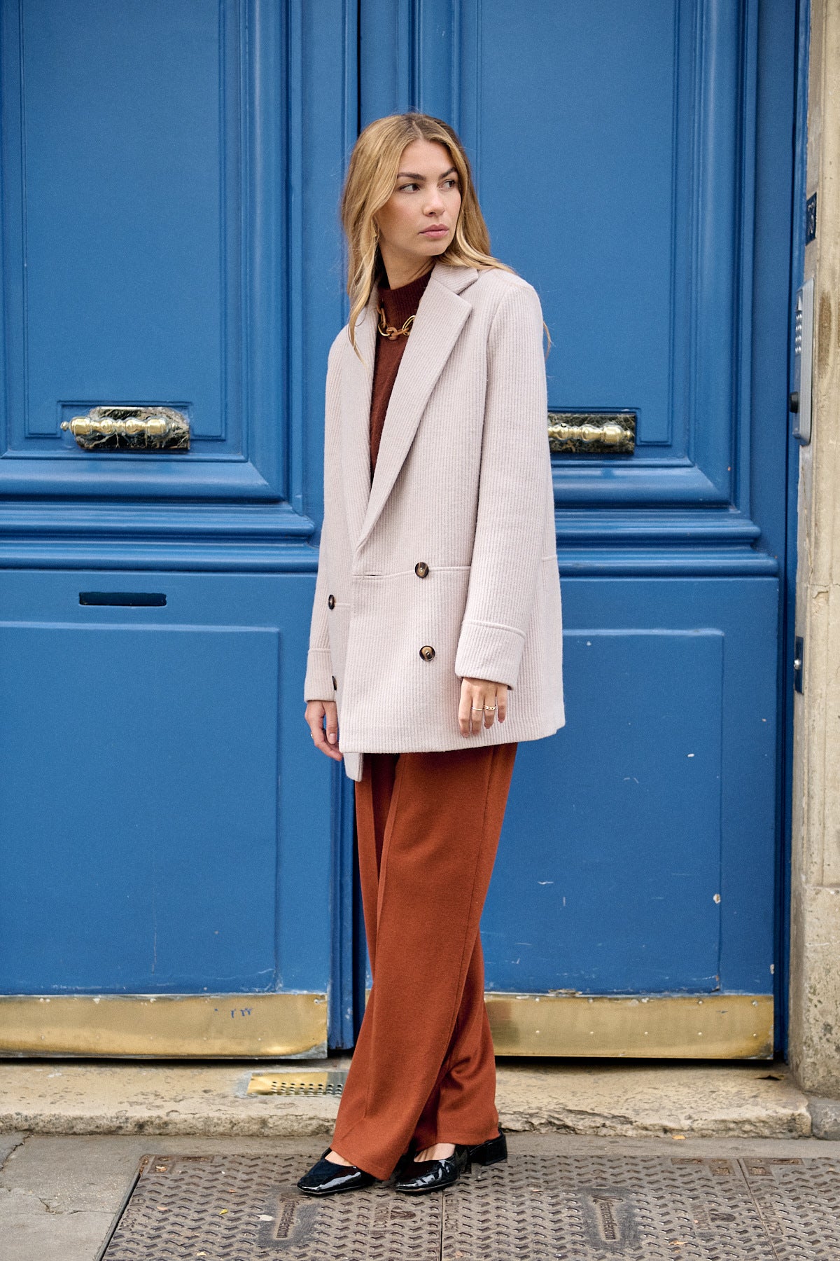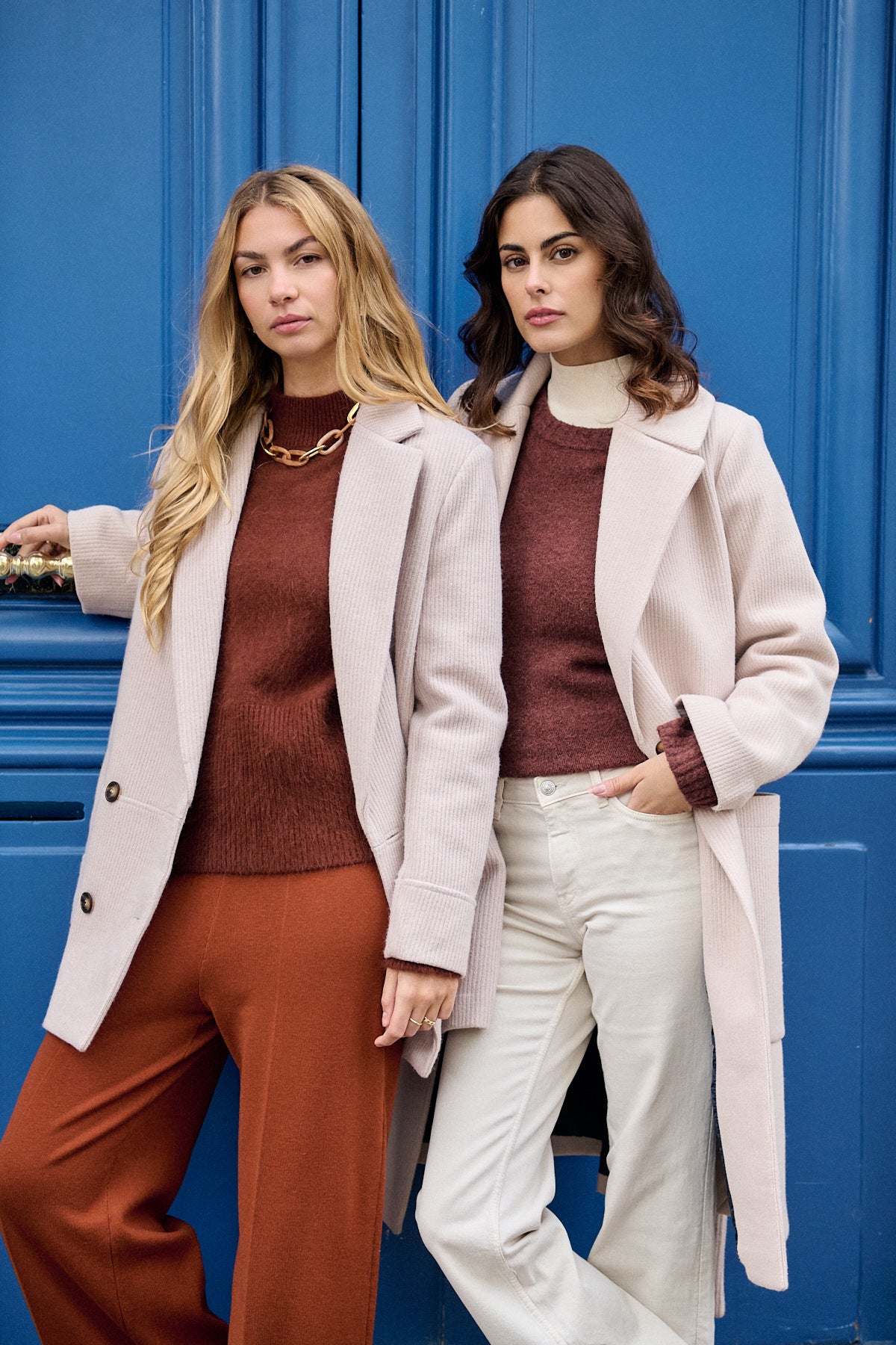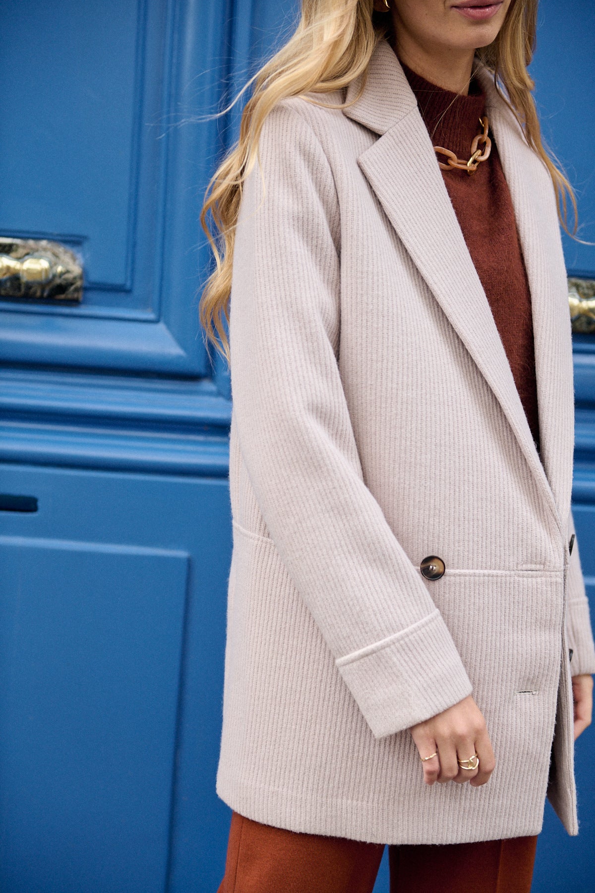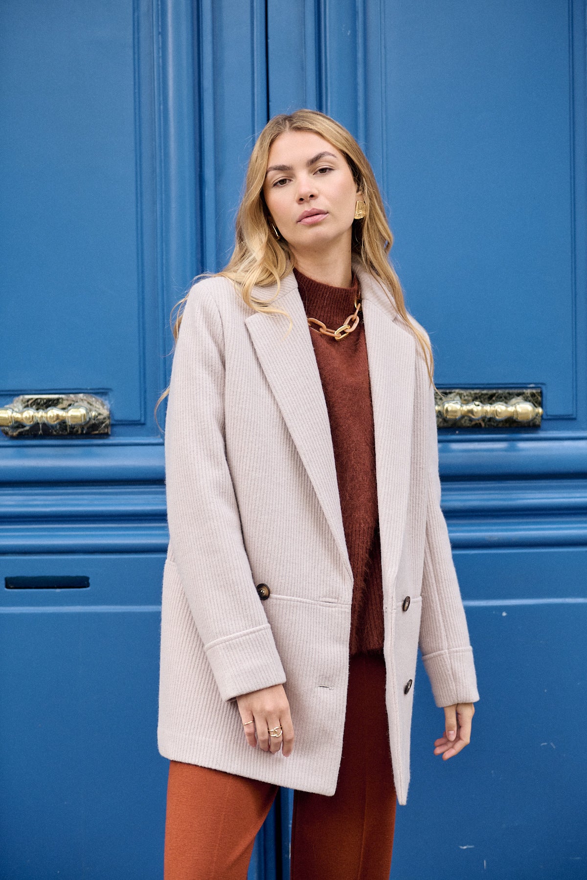 Dieser elegante Mantel mit Reverskragen vereint klassischen Chic mit moderner Passform. Die doppelreihige Vorderseite und der Taillenschnitt betonen die feminine Silhouette und sorgen für einen stilvollen Auftritt.